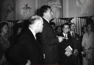 Prezentujemy kilka zdjęć z tej wystawy. Widzimy na nich Marię Prokopowicz oprowadzającą po wystawie uczestników Konferencji, w tym Prezydenta IAML – André Jurres'a z Holandii. |